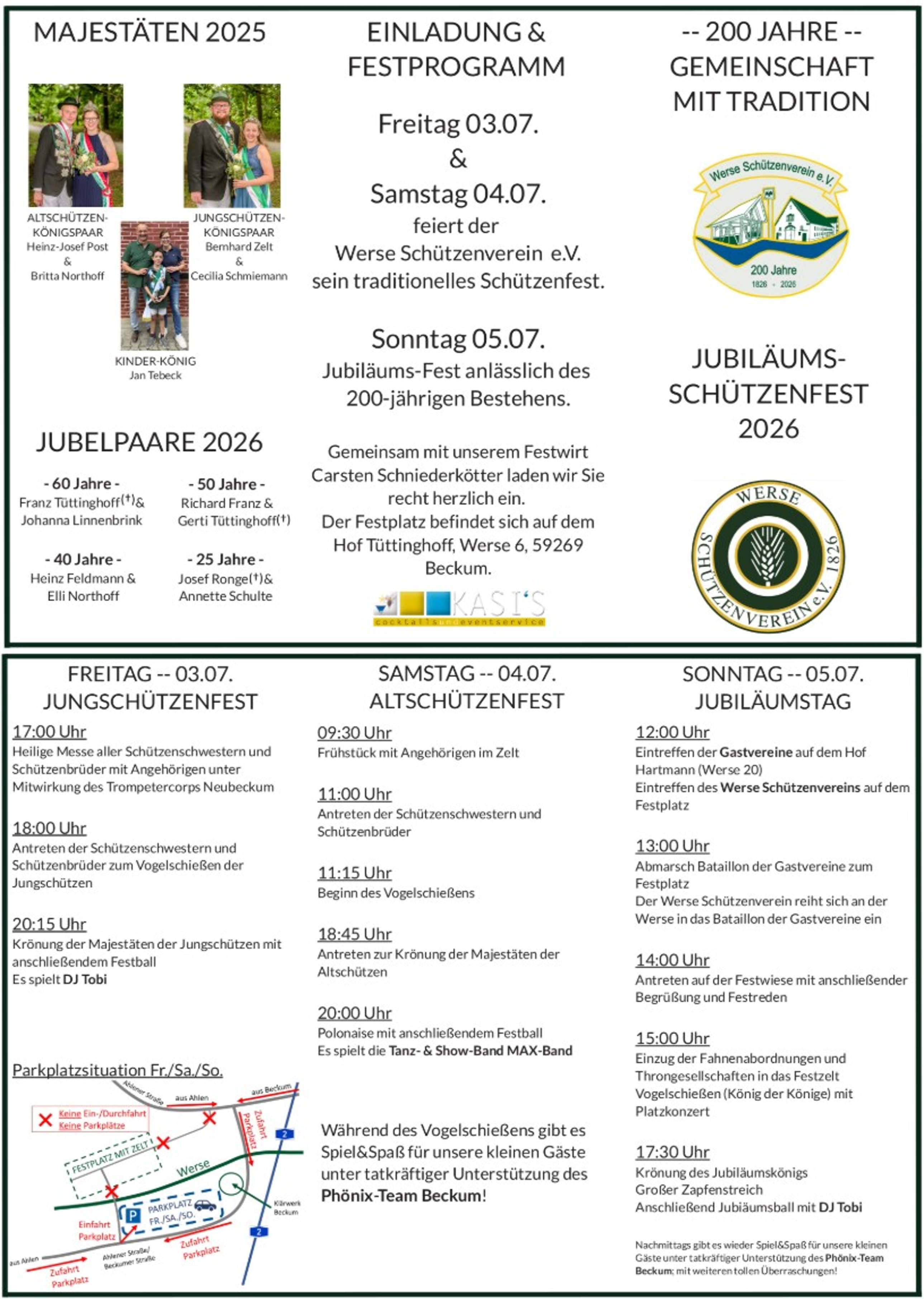 Unter dem Motto „Gemeinschaft mit Tradition“ blicken wir mit Stolz auf zwei Jahrhunderte der Schützentradition zurück, und möchten Euch schon jetzt herzlich dazu einladen. Weitere Details gehen Euch in den kommenden Monaten zu.